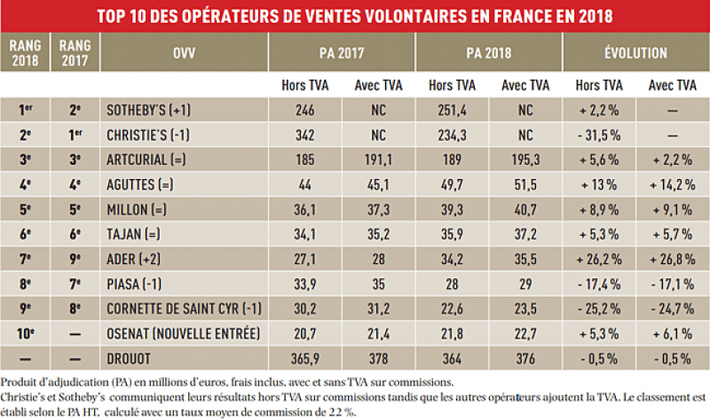 Sotheby’s détrône donc Christie’s et prend la première place du classement, une position qu’elle n’avait pas occupé depuis trois ans. Avec un total de 251,4 millions d’euros, l’auctioneer américain affiche un produit de vente record, même si sa hausse est minime (+ 2,2 %). « Si tous les départements contribuent au succès de l’année, la vente de la collection Pierre Bergé, la vacation d’art contemporain du printemps et celle d’Asie en juin ont fait toute la différence », a commenté Mario Tavella, président-directeur général de Sotheby’s France. En effet, la dispersion de la dernière partie de la collection Pierre Bergé (27,4 M€), le record pour une vente d’art contemporain en France (45,5 M€) ainsi que le record pour une vente d’arts d’Asie en Europe (30 M€) ont permis à Sotheby’s de prendre le leadership. La maison de ventes remporte également la plus haute enchère en France pour l’année 2018 avec un vase en porcelaine, Chine, dynastie Qing, époque Qianlong, adjugé 16,2 millions d’euros.