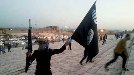 Abonnez-vous dès 1 €Un combattant de l'Etat islamique brandissant le drapeau de l'organisation terroriste à Mossoul, en Irak. © Photo : Stringer/Files.