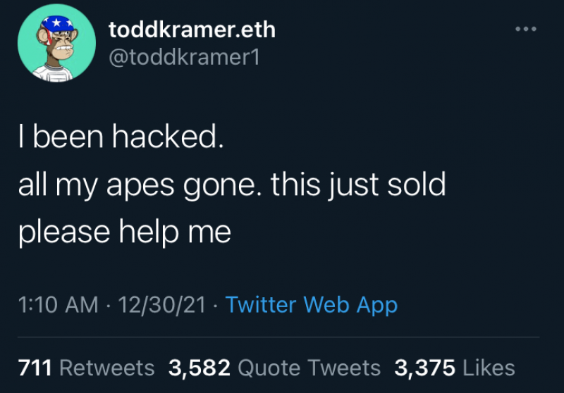 Le galeriste explique avoir cliqué sur un lien malveillant dans un message d’apparence officielle qui cachait en réalité une arnaque. Cette pratique de « hameçonnage », grand classique du piratage en ligne, a déjà fait plusieurs victimes parmi les collectionneurs de NFT ces derniers mois mais jamais encore pour une telle somme. Comme beaucoup, Todd Kramer utilisait un « hot wallet », un portefeuille entièrement virtuel constamment connecté à Internet. « J’ai appris ma leçon, a-t-il ajouté. J’utiliserai maintenant un "hard wallet" », un portefeuille physique semblable à un disque dur externe sur lequel on peut stocker ses NFT de manière plus sûre.