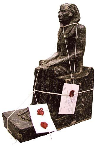 * légende photo : La statue de Sésostris III, lors de son arrivée au laboratoire SEMA en mai 2002, pour une analyse de tracéologie. © D.R.