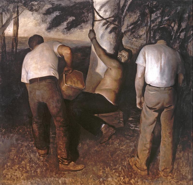 Véritable cabinet de curiosité de la peur, ce sentiment « propre du vivant » y est décliné sous plusieurs formes : de l’effroi avec la grande toile de Vincent Desiderio [illustration], toute première acquisition, montrant une scène caravagesque d’un homme sur le point d’être immolé ; ou de la stupeur dans le regard d’un autoportrait de Rembrandt (une petite gravure, 40 000 €). Ce sont également des thèmes partagés à travers les époques, comme la peur de mourir, qui se retrouvent dans les vanités présentées à l’instar du médaillon en argent Vanitas Medal de Jan de Vos ou dans la vidéo de l’artiste contemporain Paul Pfeiffer, Goethe’s Message to the New Negroes #1 (70 000 €), véritable course contre la mort.