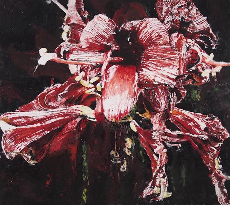 Dans cette série d’une vingtaine de toiles récentes, aux côtés de quelques roses, tulipes et tournesols, on retrouve évidemment en majorité des pivoines et des amaryllis. Autrement dit, les fleurs les plus proches de la chair en décomposition et des carcasses qu’il peignait en 2007, celles qui incarnent le mieux les deux aspects précités – vie et mort –, auréolés d’un troisième, caractérisé par une touche charnelle, voire sexuelle très marquée. Une manière de mettre sur le devant de la scène les duettistes Éros et Thanatos. Dans sa façon de cadrer son sujet en très gros plan, de façon frontale et de nous mettre vraiment le nez dans les plis et la chair des fleurs (l’exposition est d’ailleurs titrée « Carne dei fiori »), Philippe Cognée conjugue en effet parfaitement érotisme et tragédie. L’érotisme qui saute aux yeux avec tous ces pistils, corolles et lèvres qui s’en donnent à cœur joie. Et la tragédie avec une proximité du sujet, une densité de la couleur (le plus souvent rouge sur fond noir) qui accentuent la tension et font sans doute de cette série la plus forte qu’il ait jamais réalisée. Peut-être aussi l’une des plus picturales, puisque depuis ses débuts, Philippe Cognée a passé en revue tous les grands sujets de l’histoire de la peinture, paysages, portraits, natures mortes et, ici, ces fleurs comme autant de vanités.