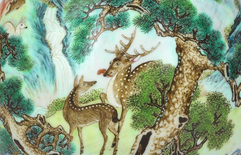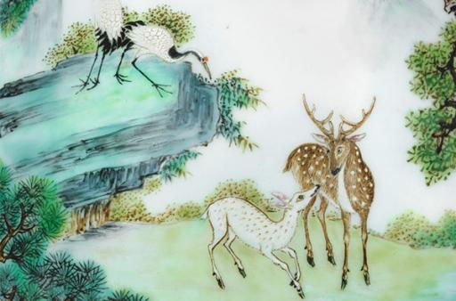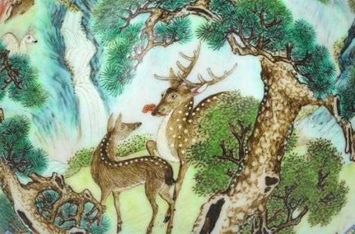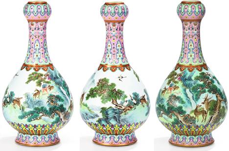En parfait état de conservation, le vase présente des décors polychromes dans lesquels dominent les tons roses. Il présente sur la panse un remarquable paysage peuplé de daims et de grues entourés de pins tordus et de pics couverts de brume. Sous sa base figure une "marque de règne" à six caractères.