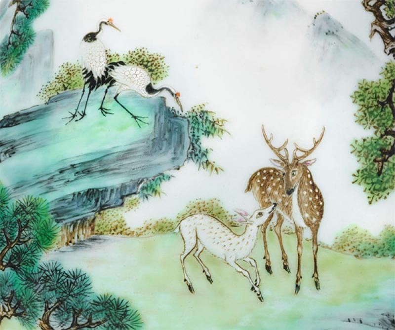 D'un dessin très libre, le paysage représenté semble imaginaire, mais il est en réalité inspiré du Parc impérial de chasse de Mulanj, l'une des résidences d'été où se rendait l'empereur pendant les périodes de chaleur. Les animaux et les plantes représentés sont chargés de symboles : le daim est synonyme de bonheur et de prospérité ; les grues, montures des immortels dans les airs, personnifient la vieillesse; le pin vert représente la vie éternelle et le lingzhi, un champignon, l'immortalité.