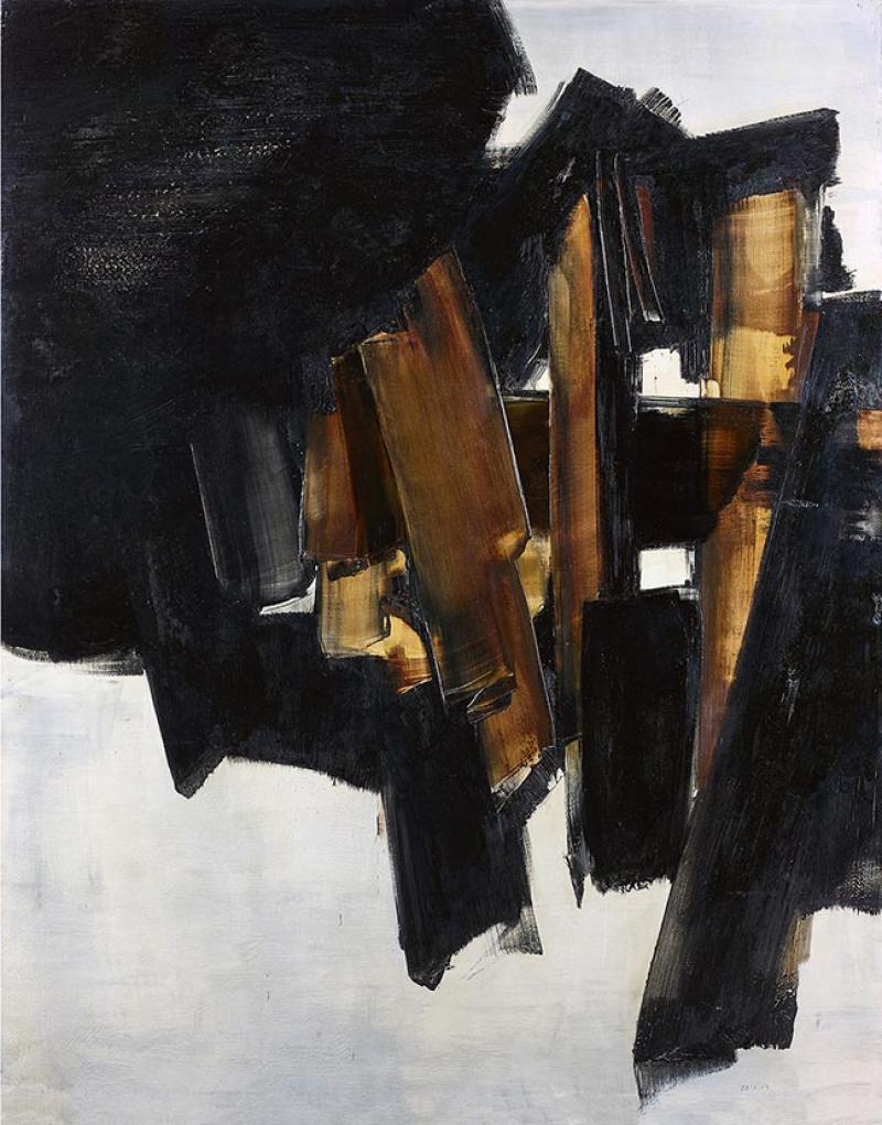 "Peinture, 200 x 162 cm, 14 mars 1960", à la lumière intense et aux plans verticaux contrastés, illustre la technique de raclage initiée par l'artiste à la fin des années 50 : sur la toile enduite d'un apprêt blanc, de larges bandes de peinture noire recouvrent une partie de la surface. A l'aide de spatules à lame souple, Soulages a découvert partiellement le fond, laissant apparaître la couche terre de Sienne sous-jacente, et offrant des luminosités inattendues.