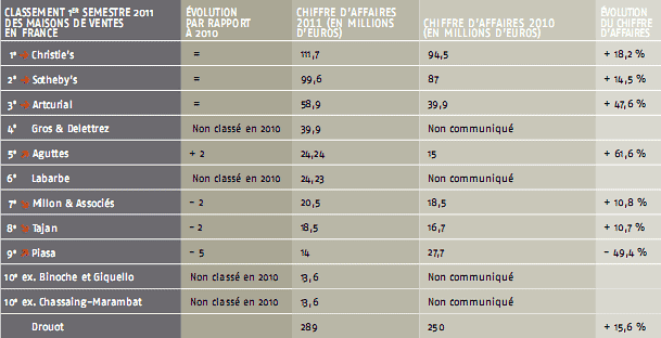 PARIS - Dans la lignée des résultats internationaux, le premier semestre des ventes publiques en France a connu une progression par rapport à 2010. À de rares exceptions près, le chiffre d’affaires des maisons de ventes a augmenté, attestant de la bonne santé du marché de l’art. Le classement des SVV (sociétés de ventes volontaires) à mi-année n’offre aucune surprise s’agissant du trio de tête : Christie ’s (111,7 millions d’euros) est coutumière de la première marche du podium, juste devant Sotheby’s (99,6 millions d’euros). Toutes les deux montrent un taux de progression modéré.