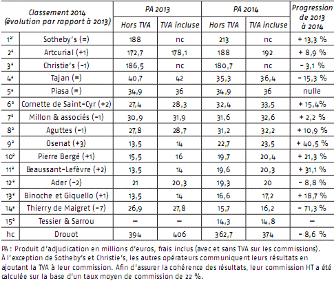 À la quinzième et dernière place, l’OVV Tessier & Sarrou signe une nouvelle entrée (14,3 millions d’euros) grâce notamment à deux enchères millionnaires en arts d’Asie (un vase meiping et un cachet impérial adjugés respectivement 2,1 et 1,8 million(s) d’euros). Quant à l’hôtel Drouot, il poursuit son hémorragie avec une perte de 8,6 % par rapport à l’an passé, passant de 394 millions d’euros en 2013 à 362,7 millions d’euros en 2014.