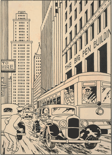 Ce dessin original (21 x 15 cm) réalisé à l'encre de Chine par Hergé, accompagné de sa mise en couleurs sur calque, un des quatre hors-texte en couleurs de l'édition en noir et blanc de 1937, était estimé entre 600.000 et 700.000 euros. Il représente Tintin, revolver dans la main droite, debout sur le marchepied d'un taxi lancé à pleine vitesse, dans une rue de Chicago à la poursuite de malfaiteurs.
