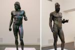 L’histoire, d’abord. Comme un conte. Il était une fois, le 16 août 1972, à l’heure où le matin dans la mer permet de voir clair, un plongeur qui rêvait de pêcher des poulpes. Là, au large de Riace, en cette Calabre belle comme l’Arcadie, le plongeur repéra, à défaut d’un tentacule, un bras, puis, avec, « un morceau d’épaule de couleur sombre ». À mesure que ses remontées à la surface brusquent le sable sous l’eau, l’homme voit se dégager une forme humaine, puis une seconde, dont il comprend qu’elles ne sont pas des cadavres mais des objets métalliques « visiblement en bronze ». Visiblement, puis tactilement, tout se confirme : Stefano Mariottini vient de découvrir deux statues ensablées dans les profondeurs. Immédiatement avertie, la Surintendance archéologique de Calabre sollicite des carabiniers plongeurs qui, une semaine plus tard, extraient de l’eau, à l’aide de cordages, puis d’un ballon gonflé à l’oxygène, deux statues antiques de presque deux mètres, bientôt baptisées « Bronze A », puis « Bronze B ». Le miracle a désormais un nom : les bronzes de Riace.