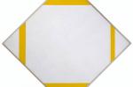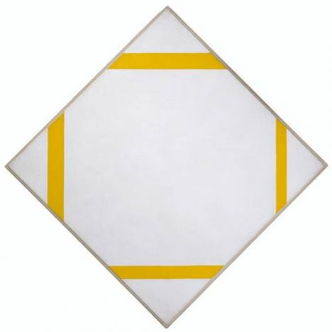 D’abord Mondrian décadre ; en tronquant ses figures géométriques soudain incomplètes, il engage leur prolongement, à travers l’imagination, dans le hors cadre. Par ce procédé, le peintre échappe à la matérialité mais non à la finitude. Il se propose donc d’aller plus loin, en représentant des croisements. Parler de croix est une erreur : une croix est un signe fini, contrairement à un croisement qui a la faculté d’être une forme ouverte. Pour accroître la puissance de ce croisement, le peintre diminue le nombre de lignes courant sur le tableau ; les formes se font, de ce fait, plus rares et moins déterminables. Sur le thème de l’infini, l’un de ses chefs-d’œuvre pourrait être Composition avec deux lignes de 1931, où une unique jonction s’impose, réfutant toute mesure. L’expérience qui suit se propose de rejeter l’angle dans le hors-champ et de ne contenir désormais dans la toile que les lignes, en témoigne Composition dans le carré avec lignes jaunes, qui est l’aboutissement suprême de sa recherche plastique sur l’absolu. Pour affirmer définitivement l’autorité de l’intersection entre verticale et horizontale, Mondrian les a confrontées à des bords obliques, en faisant pivoter sa toile à quarante-cinq degrés. Ces tableaux « losangiques » marquent la défaite de la limite diagonale et son incapacité à servir de frontière infranchissable aux croisements orthogonaux qui la renversent implacablement.