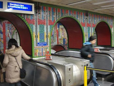 Réalisées dans les années 1980, ces mosaïques revêtaient la quasi-totalité des parois de la station de motifs colorés. Eduardo Paolozzi (1924-2005) est un artiste écossais à l’origine du Pop Art britannique. En 1986 il devint le sculpteur officiel de la Reine.