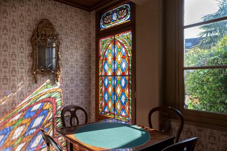 La restauration la plus spectaculaire est la renaissance du très original salon oriental, qui rappelle le goût de Jules Amiot pour l’Afrique du Nord où il a séjourné à plusieurs reprises. Passionné d’orientalisme, le maître des lieux a rapporté d’Algérie des tableaux et des objets, à l’instar de ce vitrail aux nuances chatoyantes. La décoration de cette pièce et tout particulièrement le vitrail donnant sur le jardin ont marqué l’écrivain qui décrit ses « petits carreaux de couleur » dans son roman.