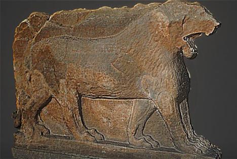 La sculpture originale monumentale à figure de lion gardait l’entrée du temple d’Ishtar à Nimrud, en Irak, avant d’être transférée dans les collections du Musée de Mossoul. Avec plusieurs statues de Lamassu, elle compte parmi les nombreux joyaux préislamiques démolis à coups de maillets et marteaux-piqueurs lors du saccage de l’institution par un groupe de Daech en 2015.