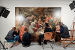 Exceptionnel, le chantier a mobilisé durant deux ans, autour des équipes de la Drac Île-de-France, plus de cinquante restaurateurs, avec le soutien du Centre de recherche et de restauration des musées de France (C2RMF). Les plus grandes toiles mesuraient plus de 4,5 mètres. Les plus petites à peine moins de 3 mètres. Il a fallu une dizaine de personnes pour descendre les plus grandes. Mais surtout, afin de prendre soin des 22 grands tableaux en même temps, le plus grand défi a été de trouver et d’aménager un lieu pour les stocker et les restaurer. « Nous tenions à ce que la restauration soit menée par une seule équipe, d’une part afin de nous assurer qu’elle soit homogène, et de l’autre, pour mieux centraliser et croiser les questions et les informations recueillies au long des différentes étapes », explique Marie-Hélène Didier. Chacune des étapes de la restauration a apporté en effet des informations nouvelles, sur leur processus de création comme sur l’histoire matérielle des œuvres. Un exemple ? Lors du diagnostic, enrichi par un dossier d’imagerie et de recherches historiques constitué par le C2RMF, les infrarouges ont mis en valeur, sur une Visitation d’Étienne Jeaurat, un large repeint dans le ciel, avant que le nettoyage du tableau ne révèle qu’une restauration ancienne avait involontairement mis au jour une figure que l’artiste lui-même avait choisi de recouvrir.