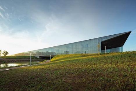 L’architecture du lieu, loin d’être un simple écrin, influe sur la vision de l’histoire, tant dans son parcours muséal que dans son insertion dans le site. Dérogeant au programme du concours, les architectes de l’agence DGT ont placé l’édifice sur une partie du site qui ne lui était pas allouée. Prenant la forme d’un monolithe de verre et de béton de 350 mètres de longueur pour 70 mètres de largeur, le musée avec sa toiture inclinée prolonge physiquement et visuellement une ancienne piste d’aviation de la base militaire soviétique qui occupait ce site de Raadi, en lisière de la ville. Longtemps, ces terrains furent interdits d’accès à la population. À l’intérieur de l’édifice, un axe majeur central accueille une des deux expositions permanentes, mais il est possible de briser le parcours en s’échappant dans des salles adjacentes ponctuant le parcours. Brisant toute idée chronologique, l’exposition est accessible depuis les deux entrées situées à chaque extrémité du bâtiment. Radical et surréaliste, ce monolithe affirme à l’échelle du paysage l’idée d’une utopie réifiée.