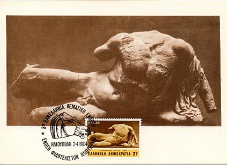 Abonnez-vous dès 1 €Carte postale datant de 1984 représentant la sculpture sans tête du dieu Ilissos autrefois située sur le fronton ouest du Parthénon - Source maximaphiles-francais.info