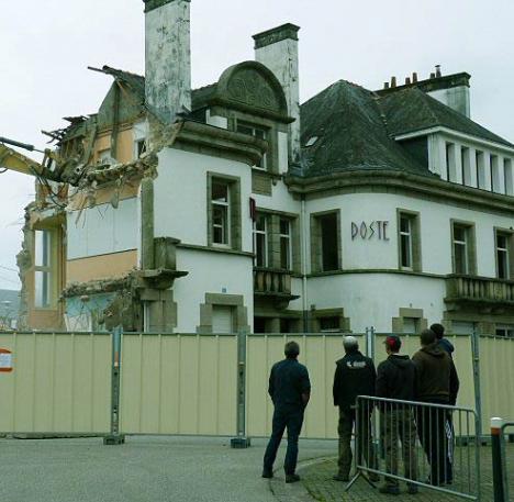 PLUMELIAU (MORBIHAN) [06.05.14] – Mercredi 29 avril, le conseil municipal avait voté la démolition de la mairie, malgré une procédure d’attribution du label Patrimoine du XXe siècle engagée par la DRAC. La municipalité n’a pas laissé le temps à l’association des Amis du patrimoine de Bieuzy de réagir et a démarré la destruction dès le lendemain matin.