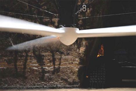 Su-Mei Tse : La pièce originale ne pouvant être présentée à Monaco par ses dimensions, j’ai choisi de créer une nouvelle pièce qui est une autre lecture de Some Airing. J’ai filmé, légèrement par en-dessous, la pièce dans les crayères du Domaine Pommery. Mais c’est en réalité un faux documentaire. Plutôt que de rendre le son produit par l’hélice, je l’ai amplifié et créé l’idée sonore du souffle. Je pense que la mémoire du son est plus présente que celle de l’image. Je voudrais que les spectateurs puissent projeter leur imaginaire. J’aime les contrastes : installer cette hélice dans une des crayères du domaine Pommery qui ressemble à une cathédrale, et aujourd’hui faire cette exposition à Monaco, haut lieu du luxe.