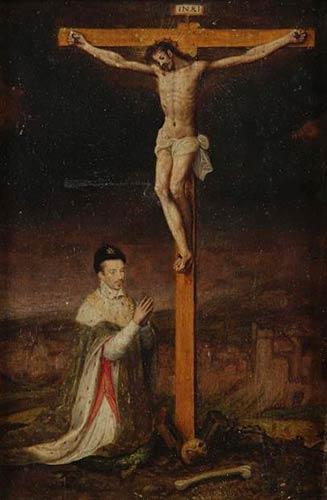 Abonnez-vous dès 1 €Henri III en prière au pied de la Croix, fin XVIe siècle, papier marouflé sur panneau de bois, 20,5 x 13,5 cm - © Photo Ader Norman